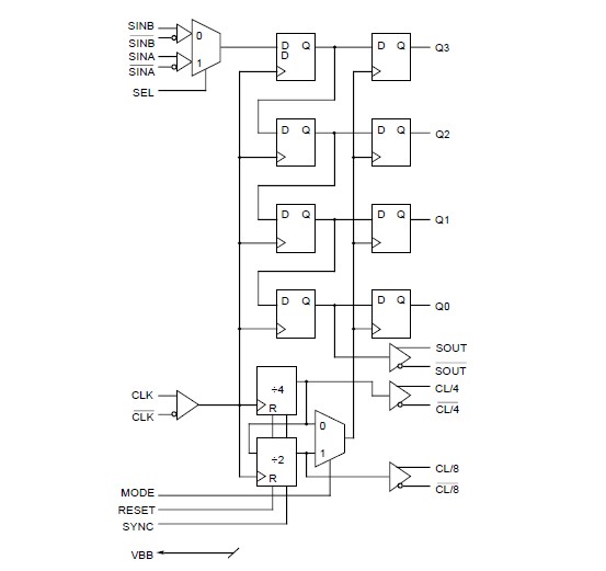 The SY10E445JC is an integrated 4-bit serial-to-parallel data converter. The SY10E445JC is designed to operate for NRZ data rates of up to 2.5Gb/s. The chip generates a divide-by-4 and a divide-by-8 clock for both 4-bit conversion and a two-chip 8-bit conversion function. The conversion sequence was chosen to convert the first serial bit to Q0, the second to Q1, etc. Two selectable serial inputs provide a loopback capability for testing purposes when the device is used in conjunction with the E446 parallel-to-serial converter. The start bit for conversion can be moved using the SYNC input. A single pulse, applied asynchronously for at least two input clock cycles, shifts the start bit for conversion from Qn to Qn-1 by one bit. For each additional shift required, an additional pulse must be applied to the SYNC input. Asserting the SYNC input will force the internal clock dividers to swallow a clock pulse, effectively shifting a bit from the Qn to the Qn-1 output (see Timing Diagram B).